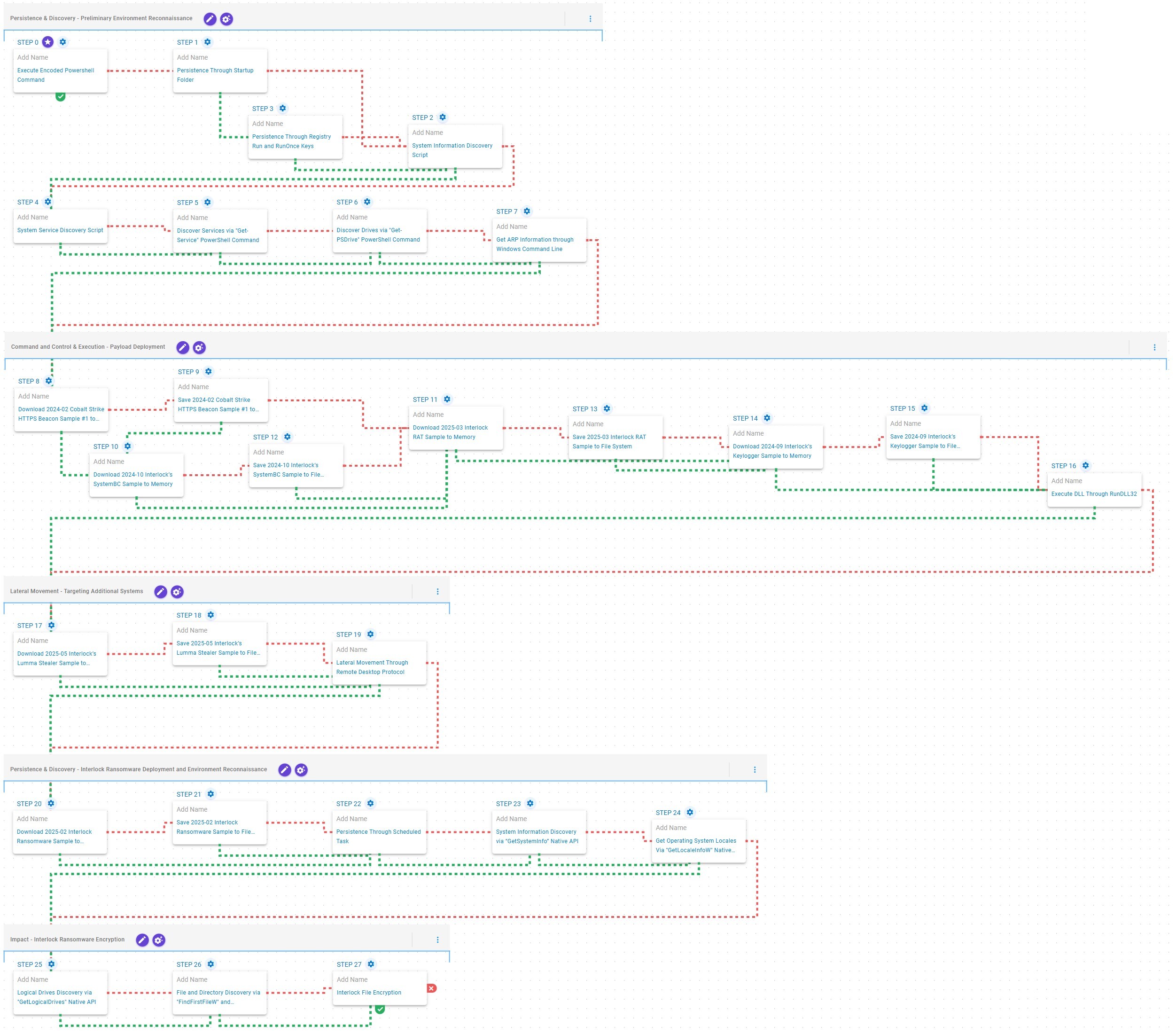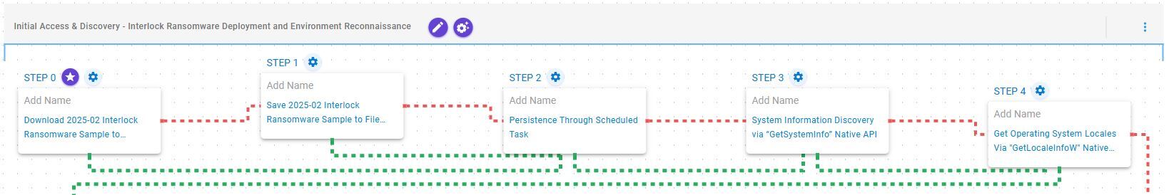 This attack graph emulates the Tactics, Techniques and Procedures (TTPs) exhibited by Interlock ransomware during its most recent activities. It is based on the Cybersecurity Advisory (CSA) released by CISA on July 22, 2025, and supported by reports published by Sekoia on April 26, 2025, and by Cisco Talos on November 7, 2024.